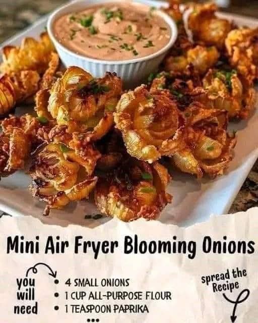 Mini Air Fryer Blooming Onions Ingredients: 4 small onions 1 cup all-purpose flour 1 teaspoon paprika 1 teaspoon garlic powder 1 teaspoon salt ½ teaspoon black pepper 2 large eggs 1 cup buttermilk 1 cup breadcrumbs Cooking spray Instructions: CONTINUE READING NEXT PAGE